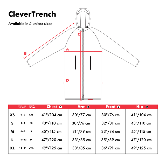 Our Trench is slim with a straight cut. It has raglan cut sleeves for easy movement, with adjustable cuffs. The pocket placement is ergonomically designed, keeping your arms at the right angle for optimal relaxation. It has a two way zipper which is handy when hopping on a bike. It's super power is the 3m reflective threading woven throughout "setting the wearer aglow like an otherworldly Tron character", Vogue.